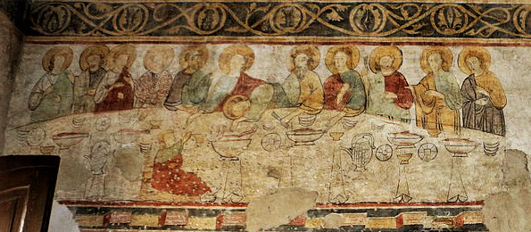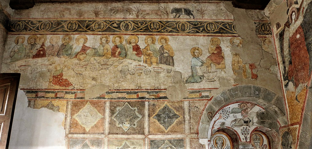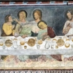 Al di sopra della bifora e alla sinistra di chi guarda, vi è il grande affresco raffigurante l’Ultima Cena e la Lavanda dei piedi. La tavola è riccamente apparecchiata, gli Apostoli sono su un lato , tranne Giuda.