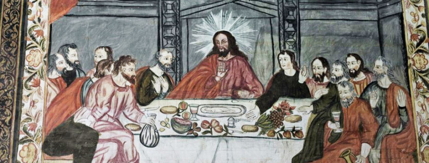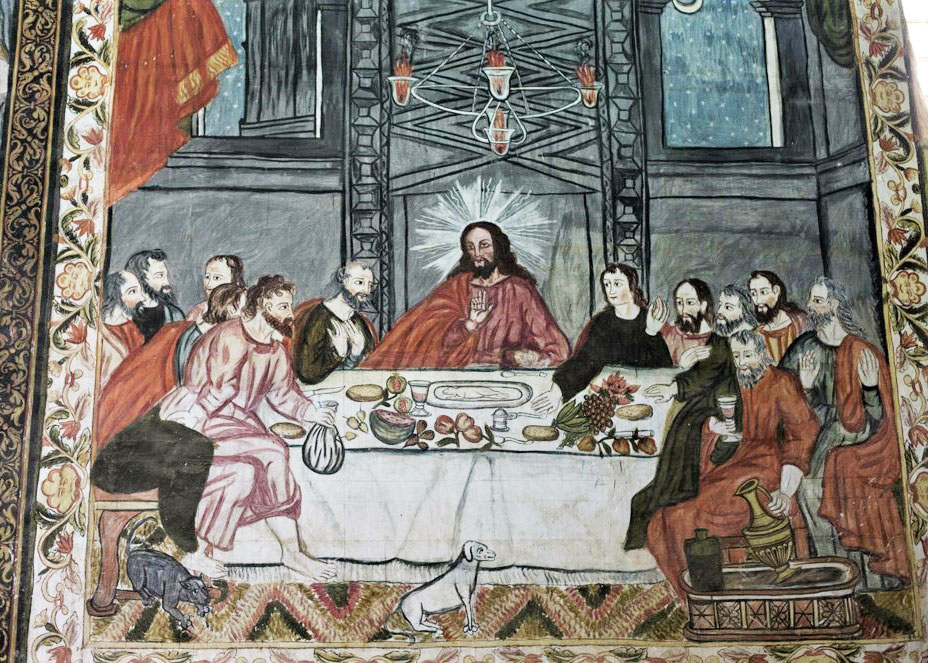 Nell’ Ultima Cena, dipinta nella navata a destra, sulla tavola c’è una cavia arrosto, popolare cibo andino presente anche in altre cene sudamericane. Un gatto traditore accompagna Giuda e un cane fedele guarda san Pietro.