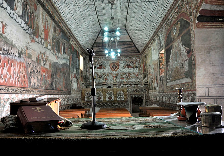 Gli storici dicono che i missionari volevano insegnare agli Aymara la Vita di Cristo, e il suo messaggio. Il più grande dipinto, sulla cupola, mostra il regno di Cristo in cielo con i suoi Apostoli e Santi. Un altro dipinto mostra l’Arcangelo Gabriele che schiaccia un demone con il piede mentre usa una bilancia per giudicare i giusti e i peccatori; un altro il giardino dell’Eden; altri episodi della vita di Gesù come l’Ultima Cena. La navata centrale è decorata fino al soffitto con la rappresentazione del Giudizio Universale. In ciascuno degli angoli sono simboleggiati i sette peccati capitali.