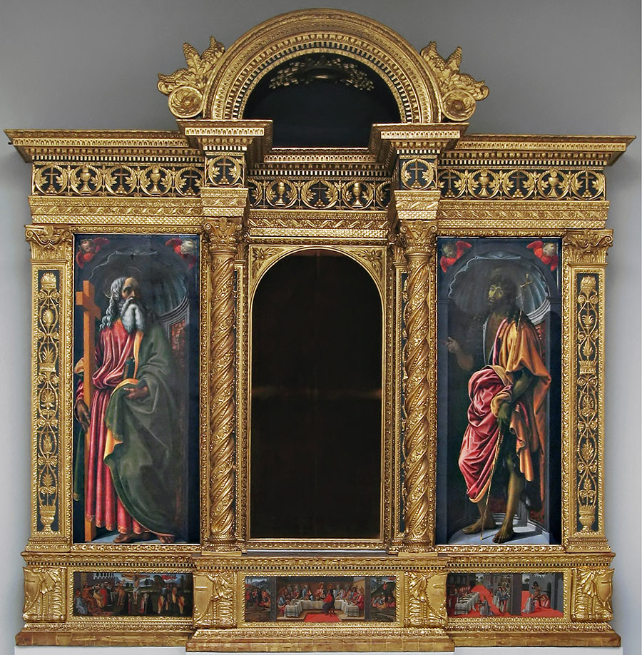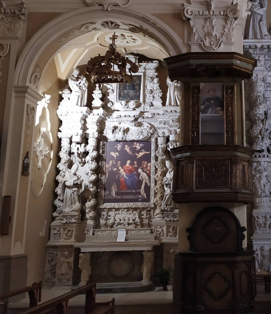 Il tabernacolo ligneo, 210 x 170 x 80 cm, ha forma di tempietto a due ordini architettonici sovrapposti; l’opera è ciò che rimane dell’originario lavoro ligneo dopo l’incendio che colpì la chiesa verso la fine del Settecento: la parte inferiore perduta nell’evento, con la secreta e i gradini dei candelieri, fu successivamente ricostruita in marmo. L’ordine inferiore del tempietto consta di tre edicole suddivise da dodici colonnine con bella decorazione a traforo. Ogni colonna in origine era affiancata da due angioletti appoggiati su di un ricciolo (quattordici erano autentici, gli altri dieci vennero aggiunti durante il restauro del 1963); tutte queste sculture sono state rubate nel 1983. Nell’edicola posta a sinistra è Cristo portacroce, mentre quella a destra è oggi vuota (conteneva la figura di Cristo flagellato). Il primo ordine è concluso dal cornicione, ora privo di sculture: su di esso posavano, prima del furto, i quattro Evangelisti e due santi martiri.