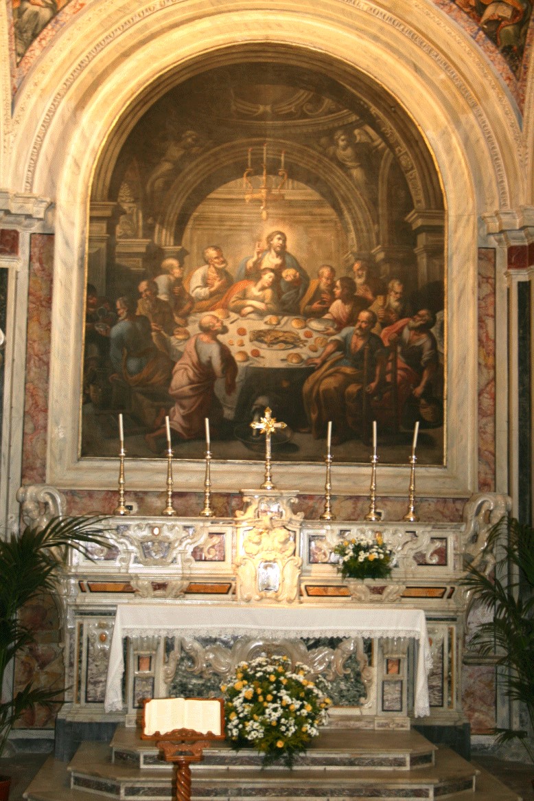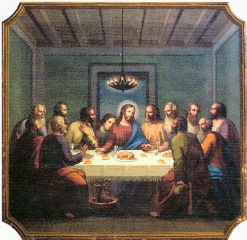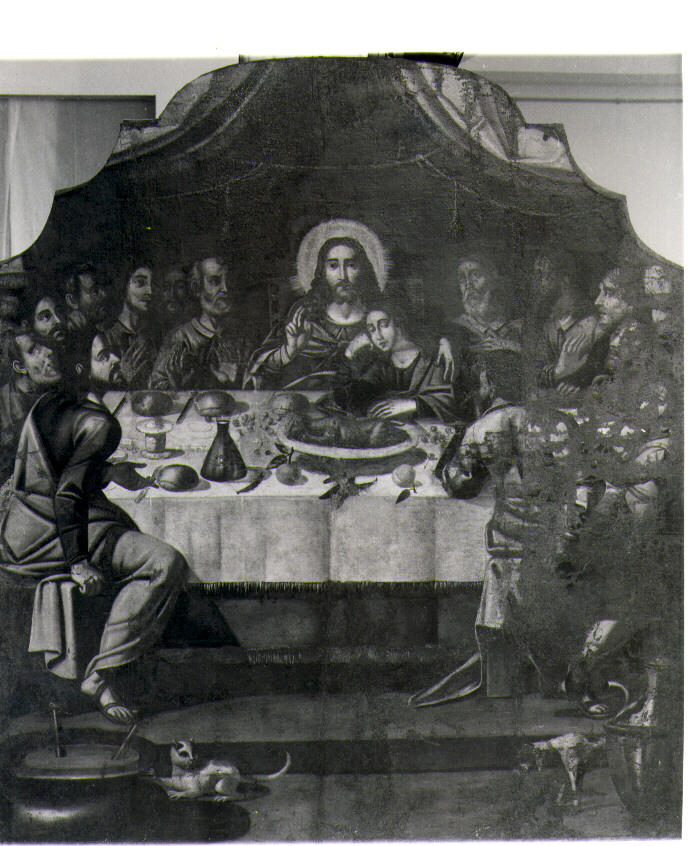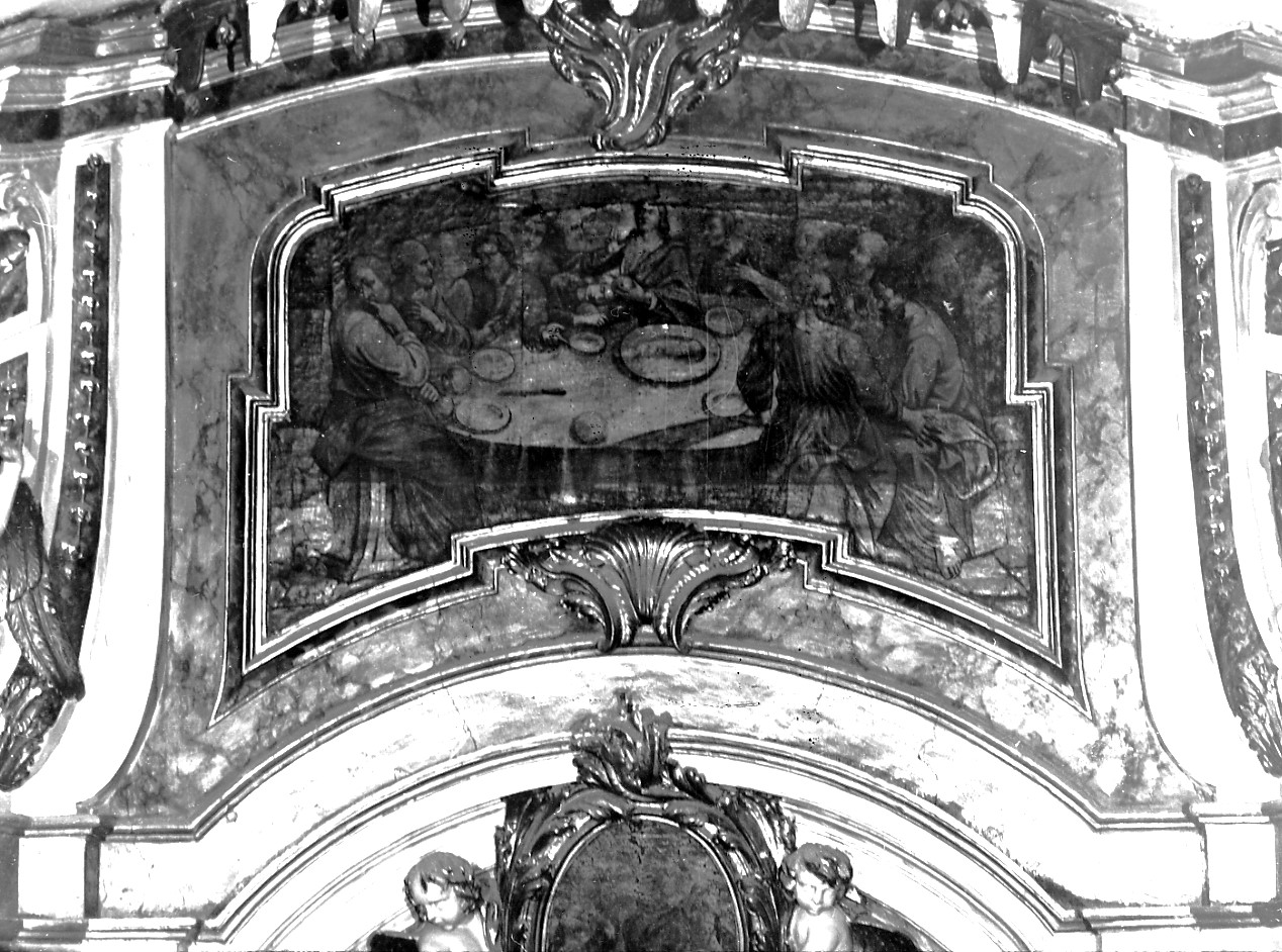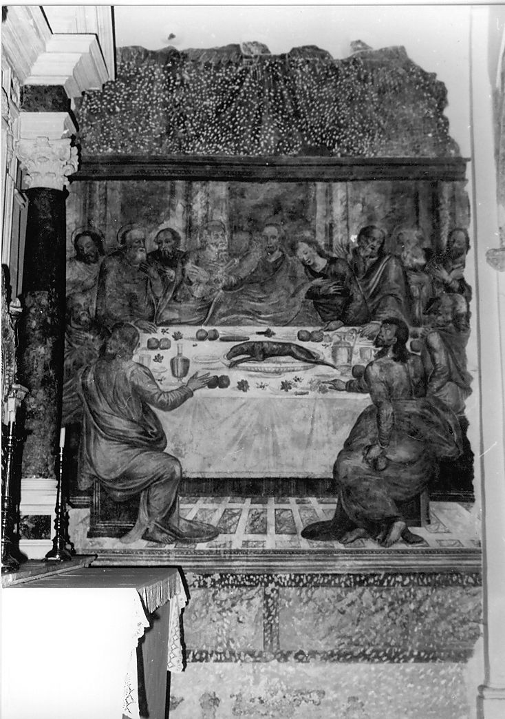 Lo spazio centrale simula un padiglione ornato di tendaggi entro il quale è rappresentata l’Ultima Cena: attorno ad una tavola imbandita sono seduti Cristo e undici apostoli (il primo a destra è recente), atteggiati in pose realistiche.