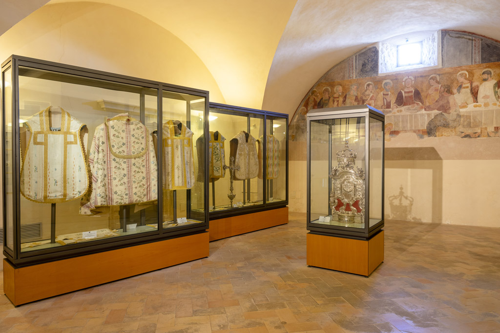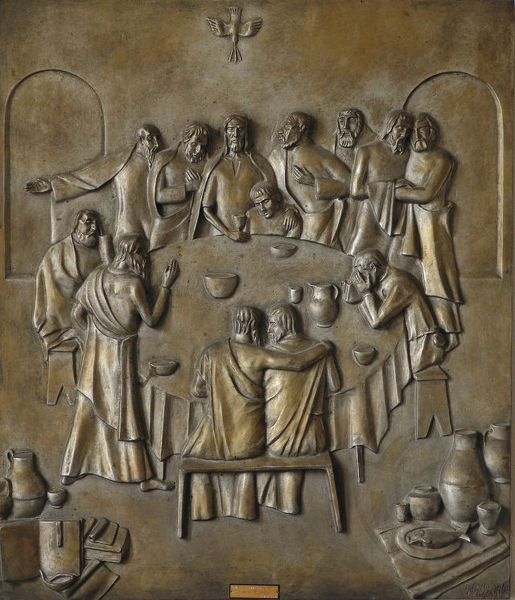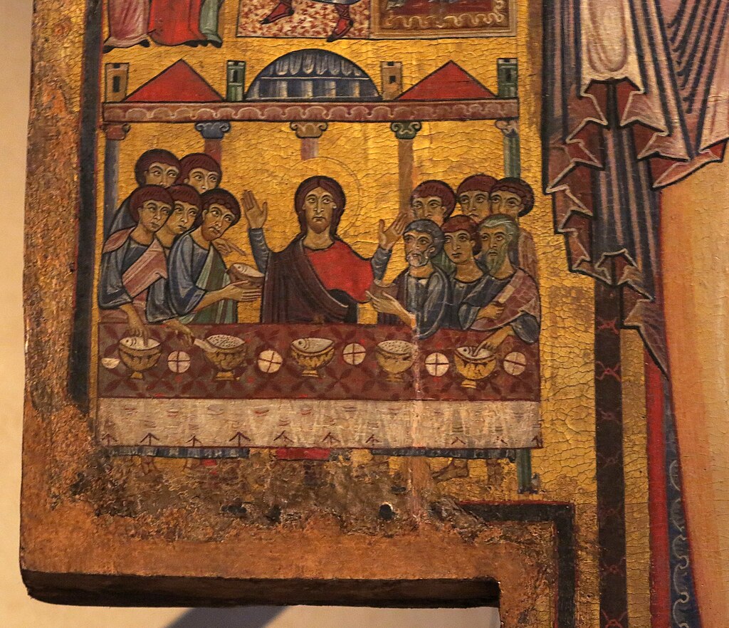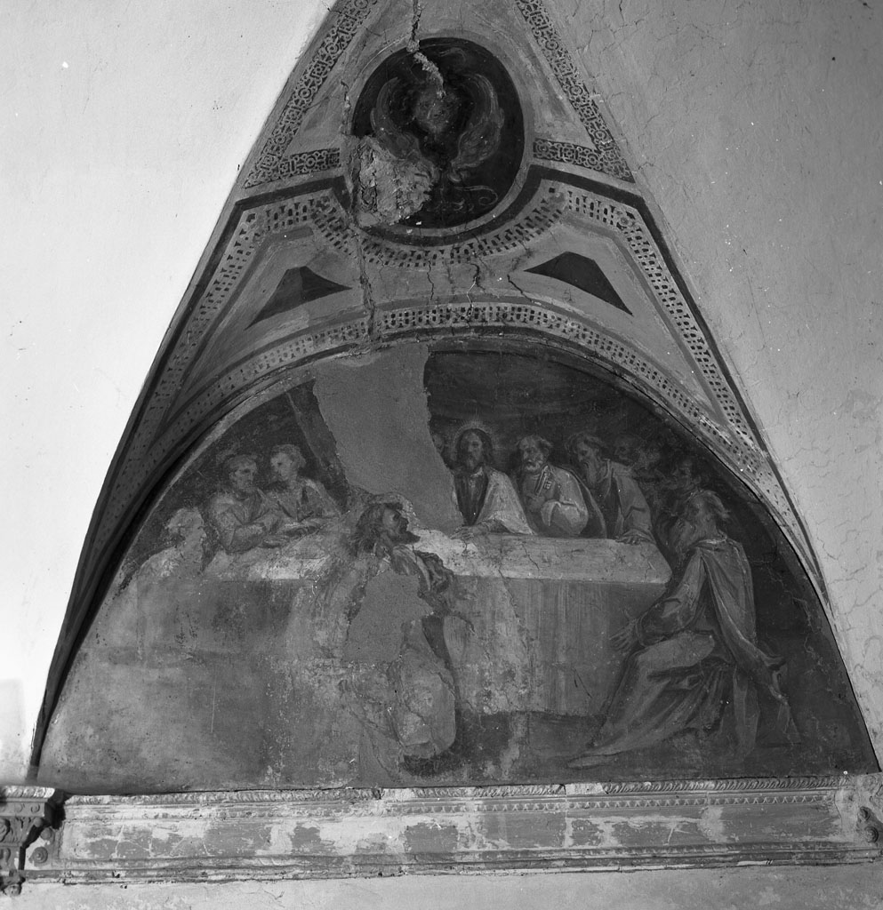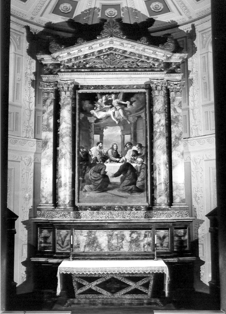 Lo spazio centrale simula un padiglione ornato di tendaggi entro il quale è rappresentata l’Ultima Cena: attorno ad una tavola imbandita sono seduti Cristo e undici apostoli (il primo a destra è recente), atteggiati in pose realistiche.