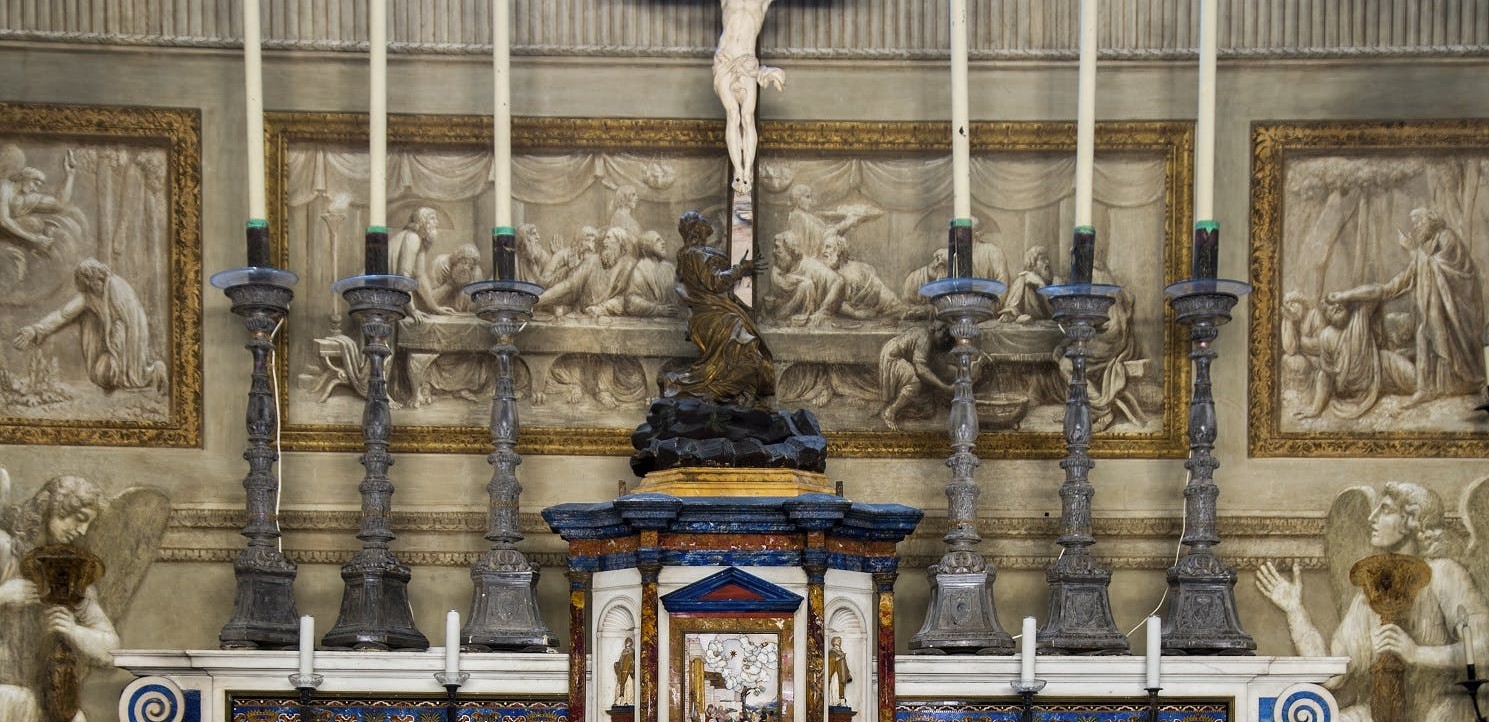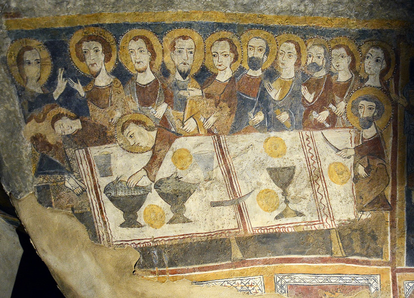 L’affresco dell’Ultima Cena è stato ridipinto, infatti nella fascia bassa della scena si notano due file di piedi, di cui quella a sinistra, di maggiori dimensioni e di minor qualità artistica, probabilmente è coeva agli affreschi delle due Sante.