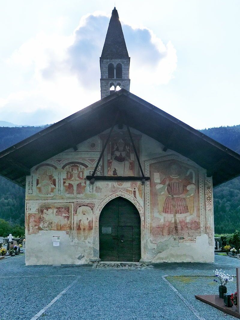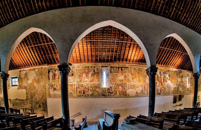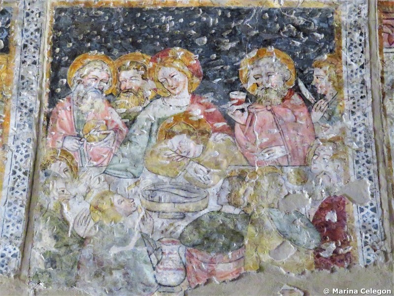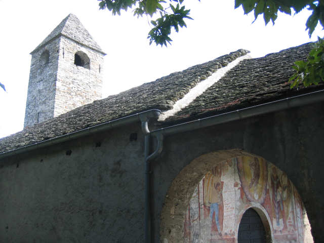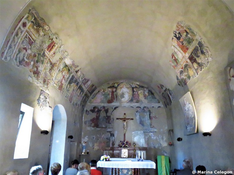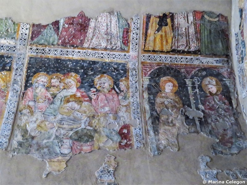 I dipinti sulle pareti della navata sono invece di stile tardo-gotico. Su quella settentrionale, sotto una Maria Egiziaca, si legge la seguente iscrizione minuscola: M . cccc . xxvij . die xxij . iunii . hoc . opus . factum . fuit…. (la continuazione è svanita), la quale data si riferisce senza dubbio alla maggior parte dei dipinti ancora esistenti. Essi sono ordinati sulla parete Nord in due serie sovrapposte l’una all’altra, di cui, quella inferiore, presenta i dipinti monocromi degli zoccoli, colle allegorie dei mesi; più in alto seguono, fino all’altezza del soffitto in assi, i variopinti quadri principali, che, principiando da oriente, danno dapprima una serie di figure di santi, poi l’adorazione dei Magi, quindi la esposizione particolareggiata ed infantile della Cena e finalmente le figure individuali di s. Bernardino da Siena e di un santo Vescovo senza attributi.