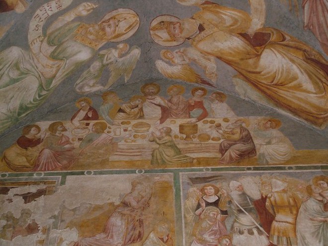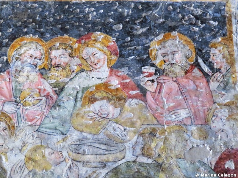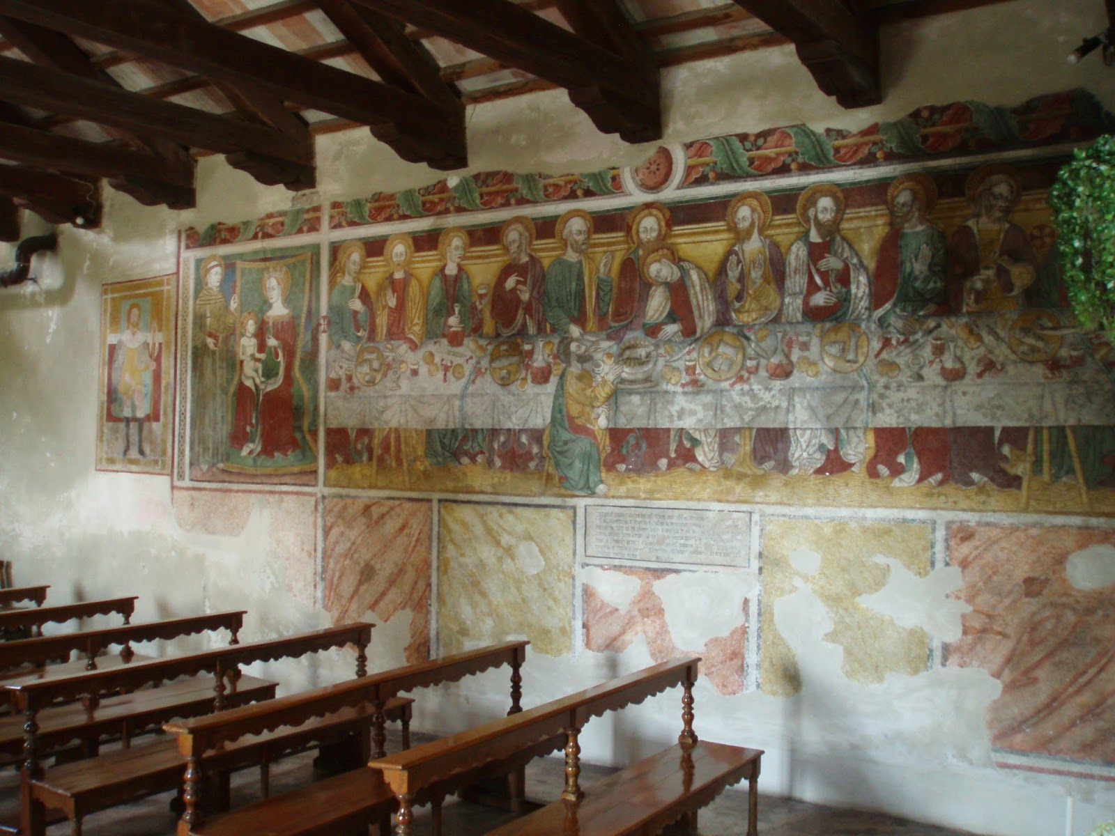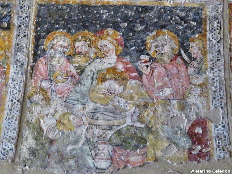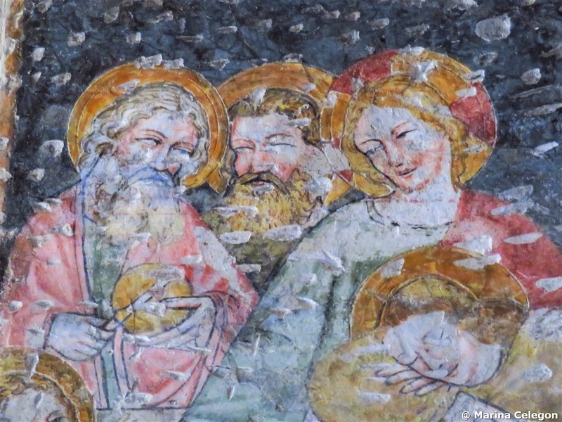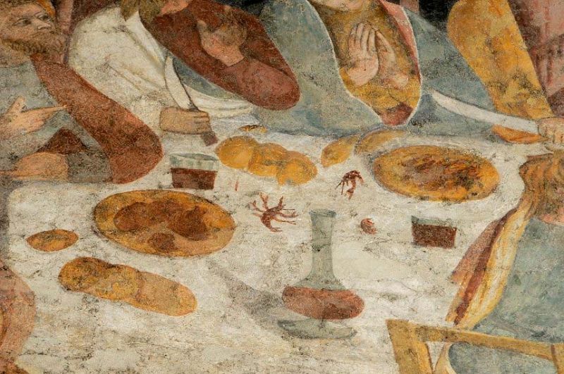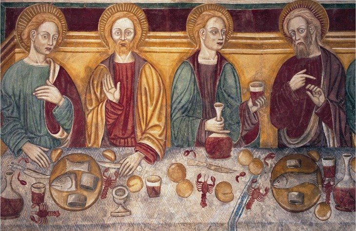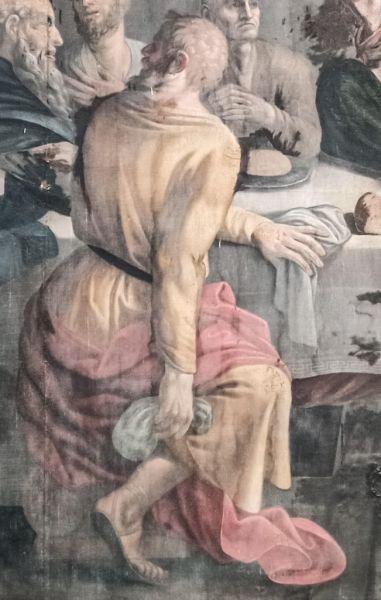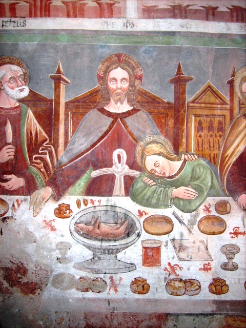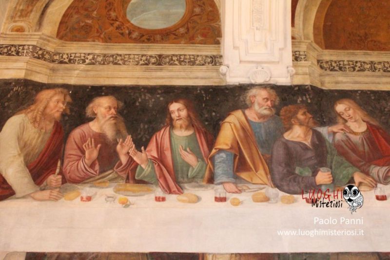 In un quadro è una interessante rappresentazione dell’ultima cena di Gesù con gli Apostoli. E’ facile la loro identificazione visto che ogni personaggio è accompagnato da un cartiglio che ne consente il riconoscimento, anche se la scrittura in caratteri gotici non sempre è di agevole lettura. La raffigurazione è una classica iconografia occidentale, nella quale prevale l’immagine del momento in cui nasce il rapporto tra Giuda e Gesù con la denuncia di quest’ultimo del tradimento imminente; per contrasto, la tradizione orientale viceversa predilige il momento della comunione. Tuttavia in questo caso comunque vi è un riferimento eucaristico nella presenza di un’ostia, o più semplicemente di un pezzetto di pane, tenuta nella mano sinistra del Cristo. La sua mano destra si rivolge verso una figura, cancellata dal degrado della pittura (o forse, chissà, da un’azione voluta) inginocchiata di fronte alla tavola. Verificando le diciture dei cartigli si scopre che sono 11 quelle degli apostoli e che tra queste manca proprio quella dell’Iscariota, il traditore Giuda, ed è quindi evidente che di lui si tratta. Parlando dei cartigli, mi ha incuriosito una particolarità alla quale non sono riuscito a dare giustificazione. Il cartiglio di Gesù sembra riportare la dizione “pristus”; la conferma che si tratta di una P si ha con la configurazione del carattere iniziale che è proprio identica a quella del vicino “petrus”. Mistero. E’ molto interessante come il pittore abbia voluto mostrare in dettaglio quanto compare sulla tavola: ciliegie, pani semplici e lavorati, stoviglie ed accessori, e gamberi che sembrano essere alla ricerca di una via di fuga.