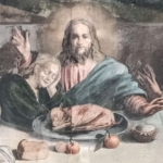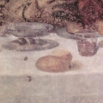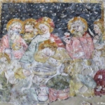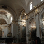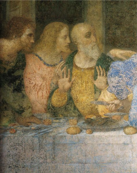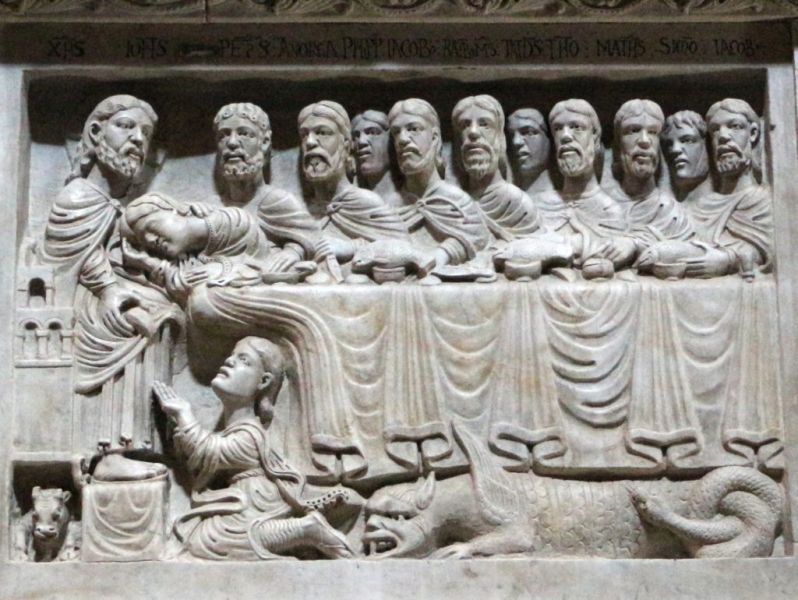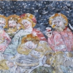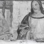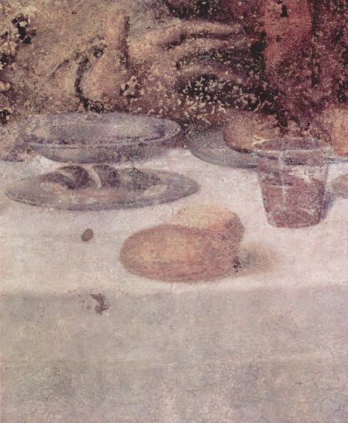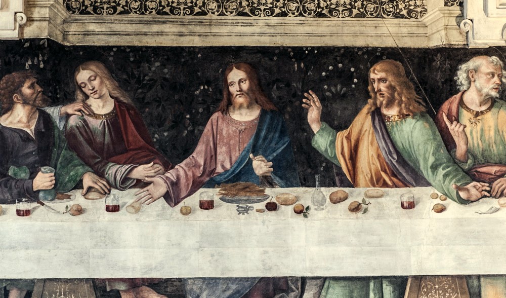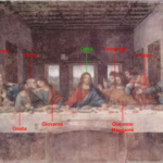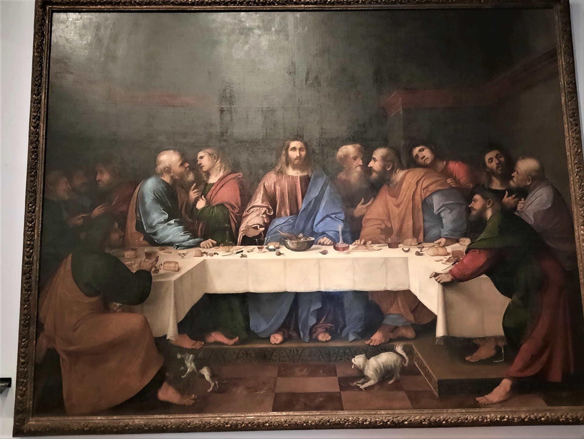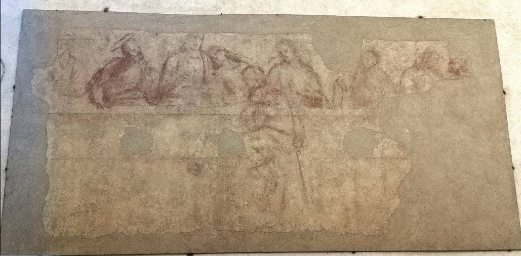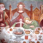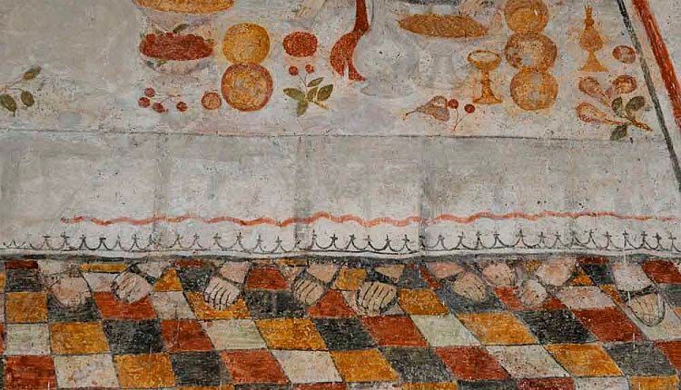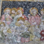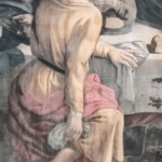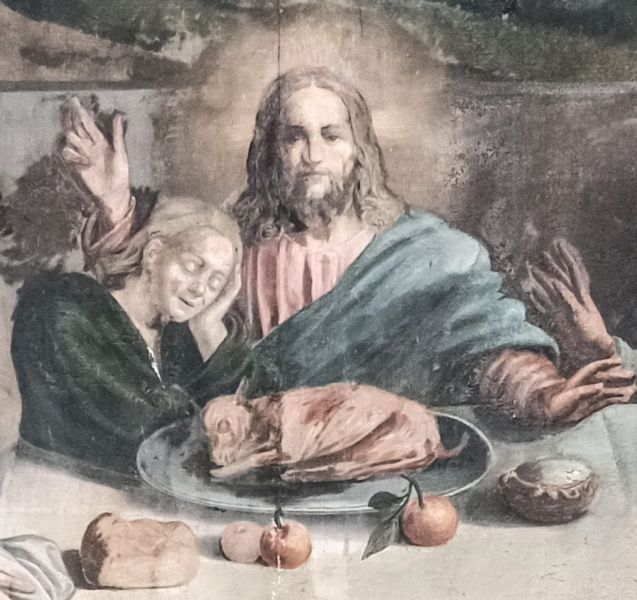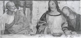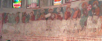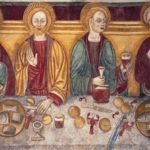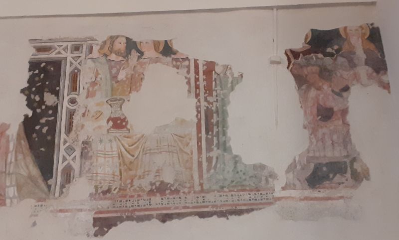 In un quadro è una interessante rappresentazione dell’ultima cena di Gesù con gli Apostoli. E’ facile la loro identificazione visto che ogni personaggio è accompagnato da un cartiglio che ne consente il riconoscimento, anche se la scrittura in caratteri gotici non sempre è di agevole lettura. La raffigurazione è una classica iconografia occidentale, nella quale prevale l’immagine del momento in cui nasce il rapporto tra Giuda e Gesù con la denuncia di quest’ultimo del tradimento imminente; per contrasto, la tradizione orientale viceversa predilige il momento della comunione. Tuttavia in questo caso comunque vi è un riferimento eucaristico nella presenza di un’ostia, o più semplicemente di un pezzetto di pane, tenuta nella mano sinistra del Cristo. La sua mano destra si rivolge verso una figura, cancellata dal degrado della pittura (o forse, chissà, da un’azione voluta) inginocchiata di fronte alla tavola. Verificando le diciture dei cartigli si scopre che sono 11 quelle degli apostoli e che tra queste manca proprio quella dell’Iscariota, il traditore Giuda, ed è quindi evidente che di lui si tratta. Parlando dei cartigli, mi ha incuriosito una particolarità alla quale non sono riuscito a dare giustificazione. Il cartiglio di Gesù sembra riportare la dizione “pristus”; la conferma che si tratta di una P si ha con la configurazione del carattere iniziale che è proprio identica a quella del vicino “petrus”. Mistero. E’ molto interessante come il pittore abbia voluto mostrare in dettaglio quanto compare sulla tavola: ciliegie, pani semplici e lavorati, stoviglie ed accessori, e gamberi che sembrano essere alla ricerca di una via di fuga.
