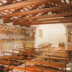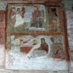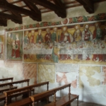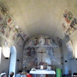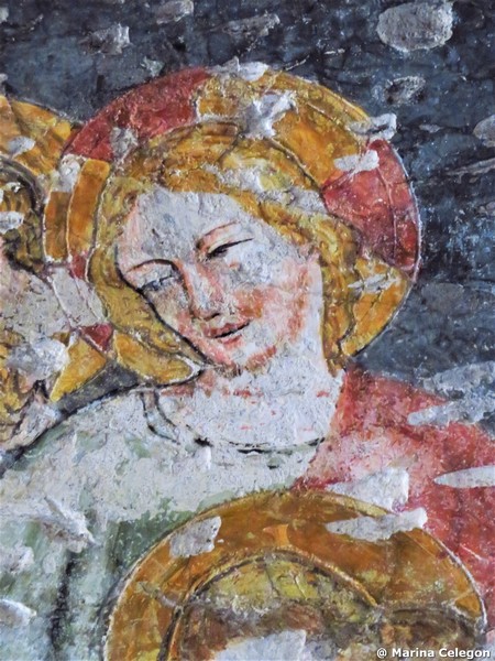 Già qui si hanno i primi sentori di cosa ci aspetta all’interno. Sopra la porticina, un affresco ci presenta la figura poderosa di San Cristoforo che, come sempre appare nella rappresentazione classica, si appoggia ad un lungo e nodoso bastone, miracolosamente fiorito dopo che ebbe traghettato sulle proprie spalle il Bambino, del quale peraltro il Santo ignorava la natura divina. Possiamo notare quanto siano accurate le sfumature del colore, sicuramente volte a ricreare un efficace effetto di plastica tridimensionalità, ma nel contempo quanto siano vaghe ed esagerate le proporzioni dei piedi; un fenomeno che potremo riscontrare anche in seguito negli altri dipinti.