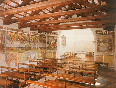 La sala del capitolo, a settentrione del presbiterio, è coperta da soffitto orizzontale in assi, le lisce pareti sono ornate da pitture che tradiscono la stessa mano che eseguì quelle della navata: sul lato Sud, la Via al Calvario ad occidente, le stigmate di s. Francesco, poi s. Caterina, s. Michele, s. Apollonia ed a Nord l’Annunciazione.