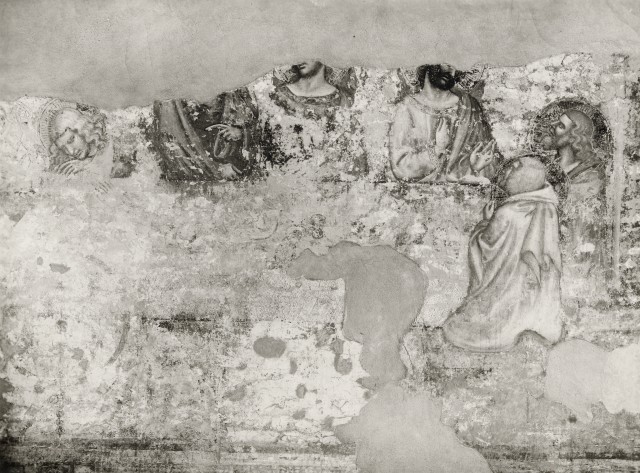 Dietro l’altare, verso il coro delle monache, vedesi la predella d’un altare di legno inciso dell’epoca tardo-gotica, colle mezze figure, liberamente incise e dipinte alla moderna, di Cristo e degli Apostoli. Alla parete settentrionale del presbiterio è appoggiala la base, a due ripiani, dello scrigno colle statuette della Madonna in piedi e di due santi benedettini, senza attributi e s. Caterina e s. Barbara, esse pure dipinte alla moderna. Più in alto, nell’arco a scudo della calotta, quattro figure in bassorilievo che ornavano le parti interne delle ancone, che ora si trovano nella sala del capitolo, ossia, una Madonna, un santo benedettino con ai piedi un drago, s. Gerolamo e un santo francescano, senza attributi, (forse s. Bernardino da Siena).