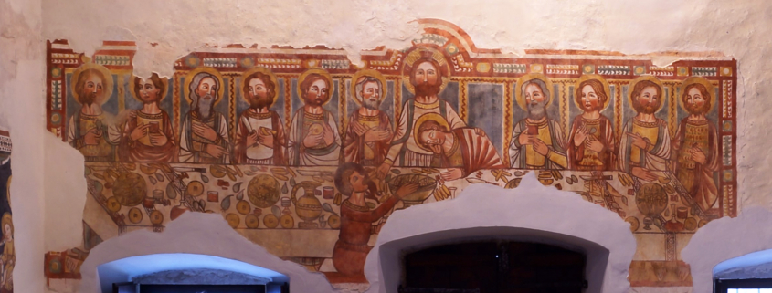 L’affresco dell’Ultima Cena si trova all’interno, sulla controfacciata, e può essere attribuito al cosiddetto Maestro di Sommacampagna, l’artista Giovanni/Jhoannes da Volpino (? – 1384/1389), che ipoteticamente fece questa raffigurazione nell’ultimo quarto del 1300. Di questo frescante di origine lombarda i sa pochissimo. Il suo nome è scaturito da un antico documento come pittore della seconda metà del Trecento, e nel corso di pochi anni la sua figura è emersa come il possibile nome a cui attribuire un gran numero di affreschi, databili tra il sesto e il nono decennio del Trecento, localizzati su un’area geografica molto vasta che, partendo dal suo presunto luogo natale, nella bassa Valle Camonica, a Costa Volpino, abbraccia l’alto Sebino, la media e l’alta Vallecamonica, la Valle di Peio, la Val di Non, la campagna a sud di Bolzano (Caldaro), l’alta Valsugana (Levico), diversi paesi del veronese (Sommacampagna, Arcè, Bussolengo, Cassano), il lago di Garda (Montichiari e Sirmione). Decine di località con quasi cento affreschi attribuibili ad una sola “mano”, o “bottega”. L’opera di questo artista tocca una parte non insignificante della cultura pittorica del Trecento; le sue modalità artistiche sono caratterizzate da un’indiscutibile vigorìa espressiva che lo rende riconoscibile in un’area insospettabilmente vasta del nord Italia.