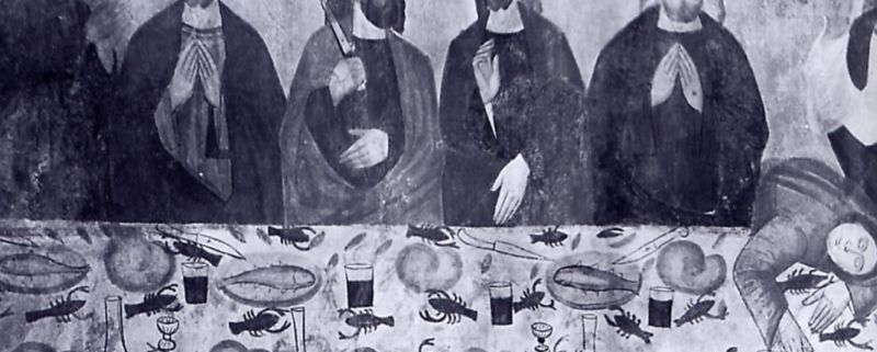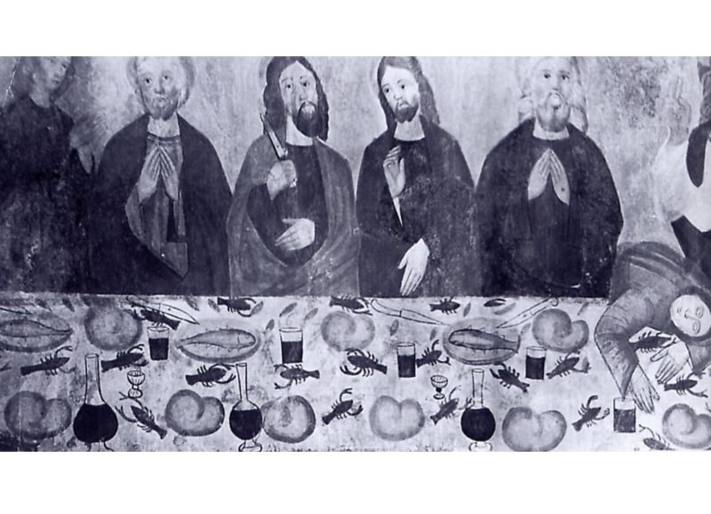 Trattavasi di ingenuo affresco popolaresco: rappresenta un’Ultima Cena con gli apostoli inespressivi ed una tavola riccamente imbandita con numerosi vivacissimi gamberi (non dissimili da quelli che si vedono in affreschi bellunesi) e caraffe e bicchieri colmi di vino.