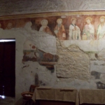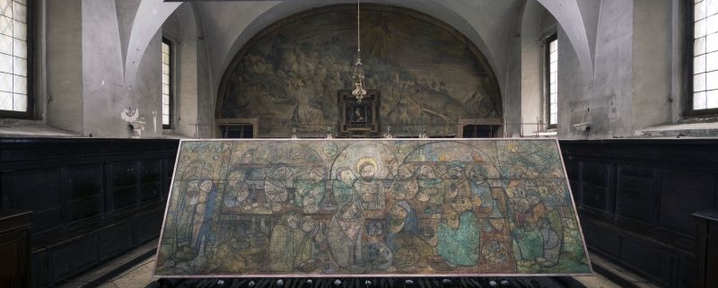 Una serie di pani rotondi, posati ai piedi dell’altare o tra le sbarre di ferro che sostengono il dipinto, le 12 posate dei convitati perfettamente allineate, a fronte dell’immagine effigiata 50 anni prima, sono tutte presenze evocative e modi che a distanza di millenni ricostruiscono un evento che appartiene profondamente alla nostra cultura.