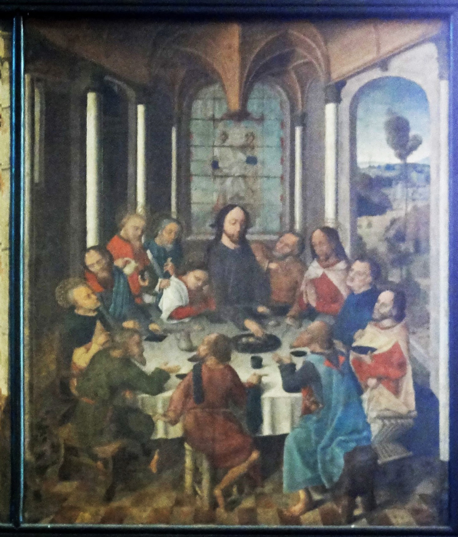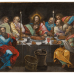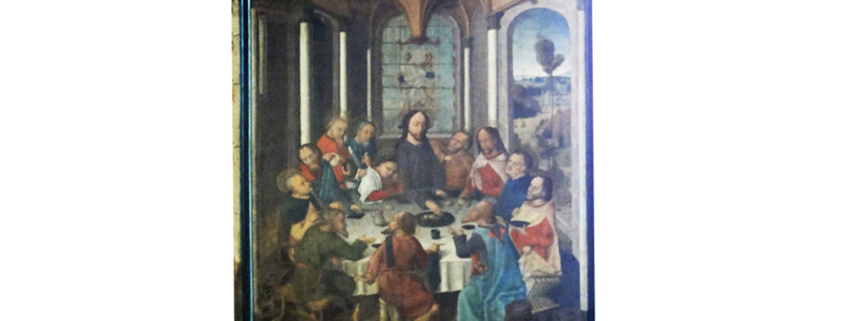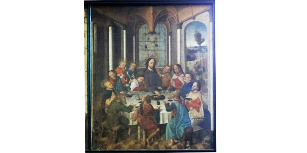 L’Ultima Cena raffigura gli Apostoli intorno a una tavola rotonda su cui sono l’agnello, pani, bicchieri, una caraffa ecc.