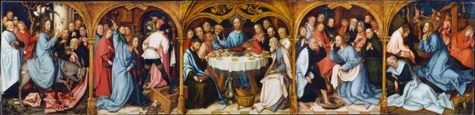 Nella tavola sono raffigurati, da sinistra, l’Ingresso di Cristo a Gerusalemme, la Cacciata dei mercanti dal Tempio, l’Ultima Cena, la Lavanda dei piedi, l’Orazione nell’orto.