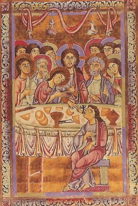Mentre Giuda riceve il pane da Cristo, un diavoletto nero penetra nella sua bocca.