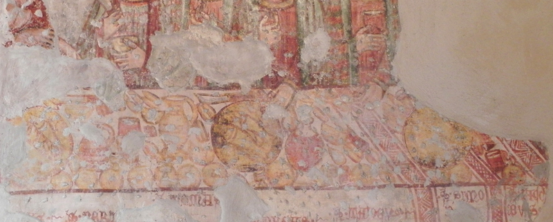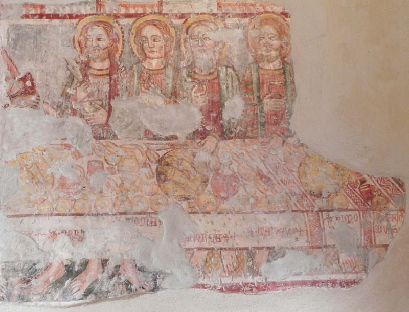 L’affresco dell’Ultima Cena è stato ridipinto, infatti nella fascia bassa della scena si notano due file di piedi, di cui quella a sinistra, di maggiori dimensioni e di minor qualità artistica, probabilmente è coeva agli affreschi delle due Sante.