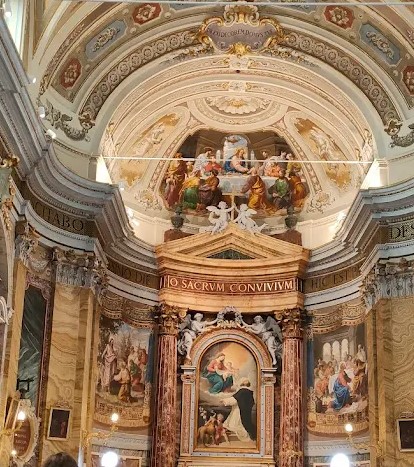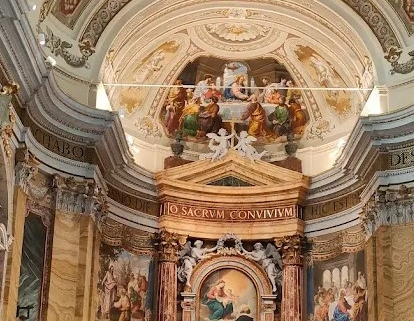 L’affresco del 1884, al centro della conca absidale, raffigura l’Ultima Cena o meglio la Comunione degli Apostoli, con Gesù che porge il pane a un Apostolo inginocchiato. Sullo sfondo un’architettura con colonne.