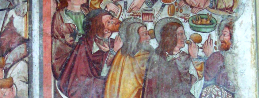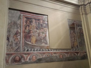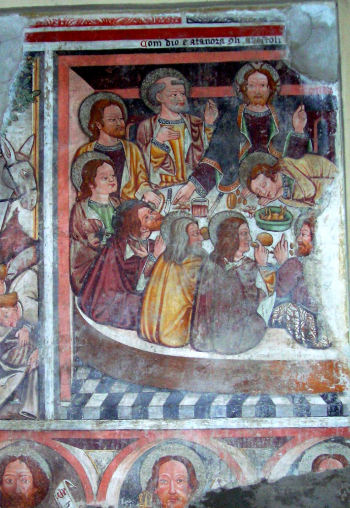 A lato dell’Ultima Cena, nella parete d’ingresso e sulla parete opposta, si susseguono scene della “Passione di Cristo”, parzialmente obliterate dalla costruzione di un portale ligneo interno. Si possono riconoscere: ingresso di Gesù a Gerusalemme, preghiera nel Getsemani, cattura di Gesù, bacio di Giuda, flagellazione, incoronazione di spine e Gesù davanti a Pilato. Gli affreschi dovevano essere tutti accompagnati da didascalie in dialetto che ne spiegavano il contenuto, di queste oggi poche sono decifrabili. Sull’Ultima Cena si legge:«Com Dio è a tavola con li apostoli».