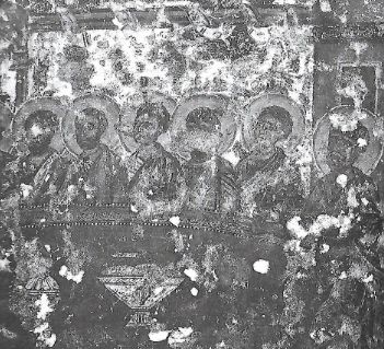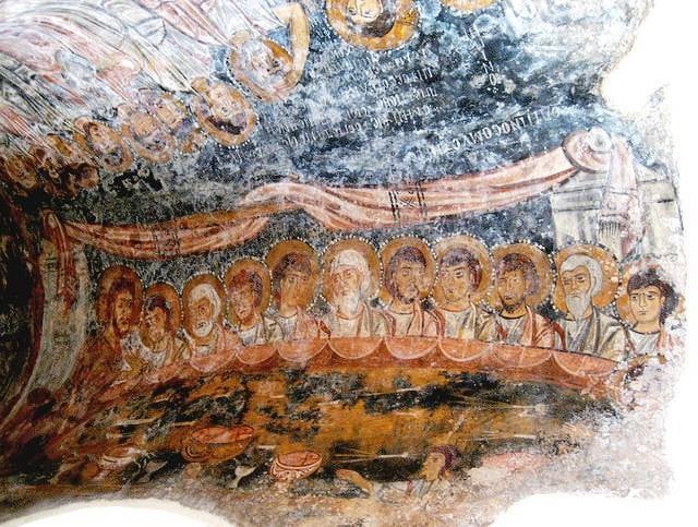 Immagine: Particolare dell’affresco dell’Ultima Cena nella chiesa rupestre di San Simeone a Famosa. La foto risale ad oltre 20 anni or sono. Oggi si presenta molto deteriorato.