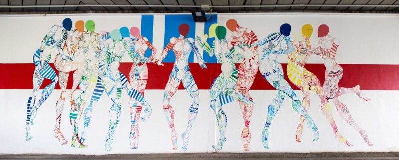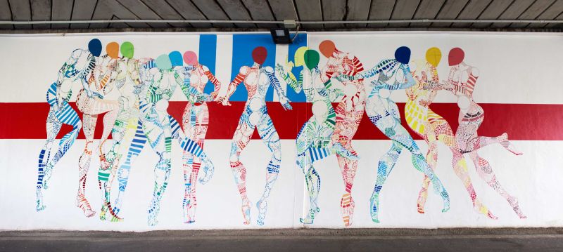 Le emozioni e le sensazioni che la sorprendente vivacità del dipinto murario fanno affiorare in chi lo osserva, concentrando lo sguardo sull’insieme delle sagome delle figure composte ma possenti, fuoriescono dal dipinto con una grazia e una prepotenza al contempo delicate ed energiche, non solo attraverso la verticalizzazione delle diverse posture dinamiche di quei manichini anonimi, così pieni di prorompente energia vitale, ma anche attraverso i colori, che, ricamando con incisiva evidenza tutta la corposità sensoriale del dipinto murario, si rivelano come gli stessi del celebre dipinto originario, ma riproposti in una tonalità ancora più vibrante e luminosa, quasi esplosiva.