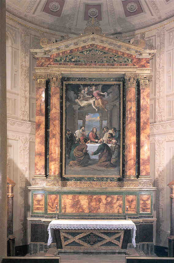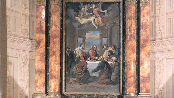 Raffigura l’Ultima Cena, con solo alcuni Apostoli intorno alla tavola; quelli in primo piano sono inginocchiati, quindi l’opera è più propriamente una “Comunione degli Apostoli”. Sullo sfondo un colonnato classico e in alto tre angeli.