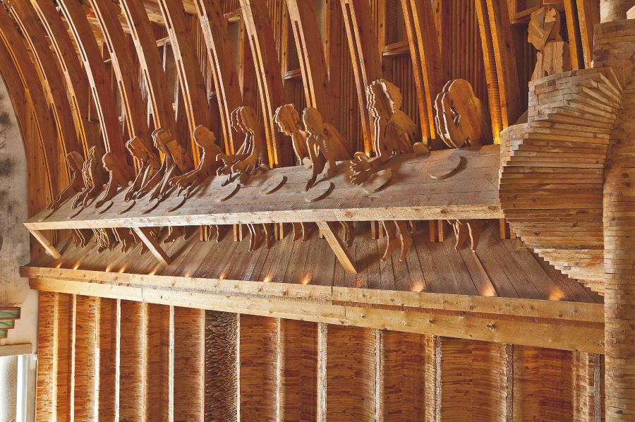 L’Ultima Cena è raffigurata sul lato destro della navata, con gli Apostoli schierati dietro la mensa e con alle spalle le travi che ricordano la carena interna di una nave, nel tipico stile dell’artista. Opera di Mario Ceroli (1938 – ) del 1971.