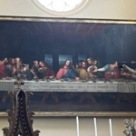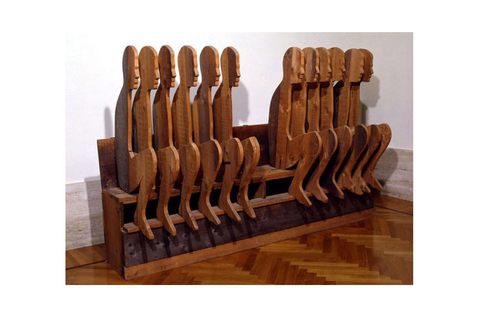 Sono 12 silouettes ripetute in serie, di legno non dipinto, in due gruppi di sei, separate da uno spazio vuoto in cui dovrebbe esserci Cristo.