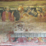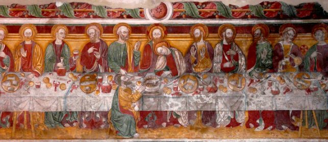 Illustrazione opera: L'Ultima Cena. Tecnica: affresco (cm 177 x 535) dipinto nella parete sinistra della navata e datato 1466. Il dipinto narra l'episodio dell'Ultima Cena e in particolare il momento in cui Cristo annuncia il tradimento (Giovanni 13-21) ai suoi apostoli: Gesù si trova al centro e dà l'annuncio con lo sguardo fisso in avanti quasi vedesse in lontanaanza il Suo destino e quello dell'uomo. Con la destra sta porgendo il boccone a Giuda Iscariota (Gv. 13-26: "...(il traditore). E' quello al quale darò il boccone dopo averlo intinto") che è ritratto seduto al di qua del tavolo, aureolato di nero e con borsa dei denari in mano; sotto di lui una scritta che lo identifica: judas. Giovanni (l'autore del quarto vangelo), il "prediletto del Signore", figlio di Zebedeo e Salòme, che morirà decapitato nel 41-44 d.C. per volere di Erode Agrippa I, appoggia la testa bionda e ricciuta sul petto di Gesù in segno di affetto e di disperazione. Alla sinistra di Giovanni c'è suo fratello, cioè Giacomo detto il Maggiore, raffigurato mentre manifesta un gesto di stupore. Vicino a Giacomo c'è Matteo Levi (l'autore del primo vangelo) riconoscibile dal pregiato abito che indossa, segno allusivo del redditizio mestiere di esattore delle tasse che egli esercitava. Alla sinistra di Matteo è ritratto l'apostolo Tommaso, l'unico dei dodici che conserva ancora ben leggibile il nome scritto sopra l'aureola: S. Thomas. Alla sinistra di Tommaso, raffigurato nell'atto di versare da bere, c'è Andrea, fratello minore di Simon Pietro, figlio di Giona e Betsaisa, che merirà martire a Patrasso intorno al 60 d.C. appeso ad una croce a X. Vicino a lui sta un giovane biondo e sbarbato che si indica. Si tratta dell'apostolo Filippo che morirà martire crocefisso a testa in giù forse ai tempi di Traiano. Alla destra di Gesù è inconfondibile la figura di Simone detto Pietro, fratello di Andrea, ritratto secondo la tradizionale iconografia e cioè con pochi capelli ed una corta barba bianca. L'apostolo vicino a Pietro è Bartolomeo di Cana che morirà decapitato dopo essere stato scorticato dal re Astiace. Anch'egli qui è ritratto nell'atto di indicarsi. Alla destra di Bartolomeo c'è forse Giuda Taddeo dipinto mentre tiene in mano un bicchiere pieno e un boccione di vino. Vicino a lui, con gli occhi fissi in avanti, è certamente ritratto Giacomo di Alfeo, detto il Minore. Chiamato da Giovanni "fratello del Signore", egli ripropone effettivamente le sembianze di Cristo ed il suo sguardo fisso nel vuoto. L'ultimo apostolo alla destra di Gesù dovrebbe essere Simone lo Zelota, qui ritratto con la mano sul petto in segno interrogativo. La scena dell'Ultima Cena si svolge in un ambiente dalla resa prospettiva sommaria, tutti i personaggi tranne uno sono seduti su una grande panca dallo schienale giallo che vuole ricordare l'oro della tradizione bizantina simbolo dell'onnipresenza divina. Due cavalletti a trepiede, sorreggono una lunga tavola imbandita e ribaltata in avanti per mostrare ciò che contiene: un agnello (chiara allusione a Gesù sacrificatosi per la salvezza dell'uomo), pagnotte, piatti con pesci, bicchieri e bottiglie di vino rosso e bianco, e gamberi rossi (entrambi messi dal pittore con l'intento di far sentire il fatto narrato più vicino alla realtà dello spettatore). Nella parte bassa del cenacolo, decorata con finte lastre di marmo, c'è una epigrafe latina scritta in caratteri gotici che recita: Factum et complectum fuit hoc ops: tepote venerabil et Reveredi v(iri archi)presbiteri fracisci aquarteriis de veneciis dignissimi ac benemeriti plebanis plebis sancti pauli del patriarcha: Nec no dni psbiteri johani de rogeriis de ast honorabilis chapellani eiusdem domini plebani supra scripti: Sub mass(aria) et juraria providorm virorm S jacobi de capiluno et S fracisci perucii: Cu conse(nsu) hominu comunis ville (san)ti georgii del patriarcha: M°- CCCC° - LX - VI° - die - XXVIII° septebris - ad honore homipotetis dei eiusque gloriosissie virginis matris marie - e (sanct)i i georgii" Il messaggio che l'affresco dell'Ultima Cena sanpolese vuole diffondere è chiaro e immediato e va inteso come preannuncio del sacrificio di Cristo fatto per la Redenzione e la Resurrezione dell'uomo. Fonte: http://chiesadisangiorgio.peruzzetto.org/l-ultima-cena.html