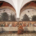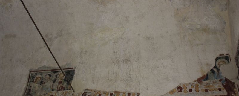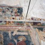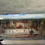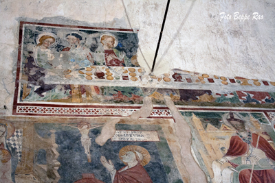 Fra questi una Ultima Cena, rovinata da interventi edilizi successivi. Solo tre Apostoli a sinistra e due a destra sono interamente conservati, sotto la mensa vediamo panneggi e piedi dei commensali, variamente mossi. E’ insolita una mensa cosi ricca di bicchieri colmi, di bottiglie di vino, e di grande abbondanza di pagnottelle sparse. Il Cristo era probabilmente in posizione mediana, nel punto in cui sulla mensa si trova una grande coppa (inizi 1400). Probabilmente della stessa mano del Santo Vescovo del registro sottostante.