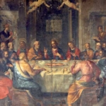 Gesù al centro, circondato dagli Apostoli, è in piedi e sta porgendo un boccone a un Apostolo inginocchiato a sinistra.