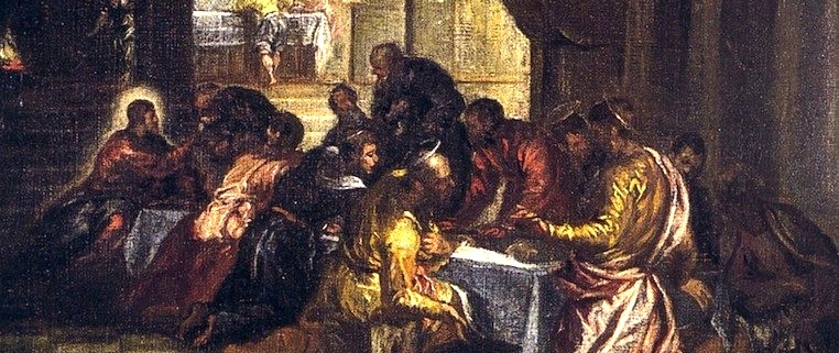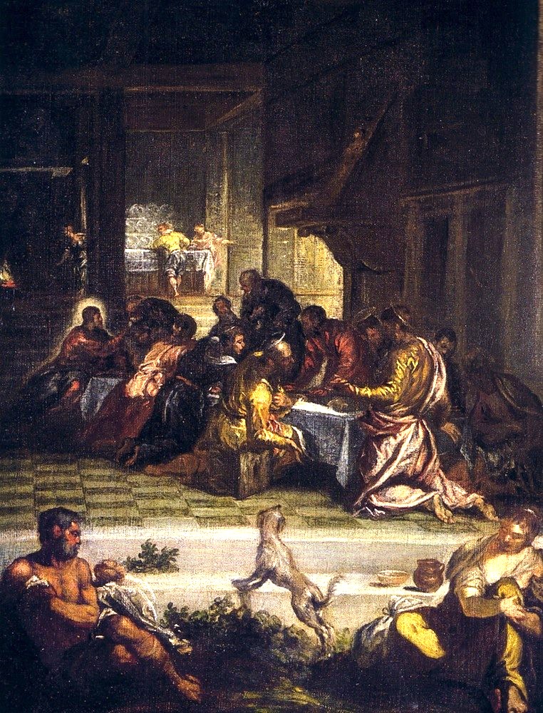 L’opera è una copia in piccolo formato dell‘Ultima Cena di Jacopo Tintoretto, conservata nella Scuola Grande di San Rocco a Venezia, vedi scheda: https://www.ultimacena.afom.it/venezia-scuola-grande-di-san-rocco-ultima-cena/