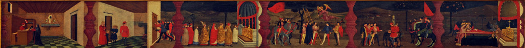 Pala e predella formavano un insieme racchiuso entro un’unica cornice e i due pezzi furono separati prima dell’ingresso nel Museo. La predella (43 × 351 cm totali) è di Paolo di Dono detto Paolo Uccello (1397 circa – 1475), dipinta nel 1467-1468, per approfondimenti vedi: http://www.gallerianazionalemarche.it/collezioni-gnm/paolo-uccello-miracolo-dellostia-profanata/.