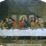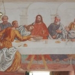 Cristo, aureola incrociata decorata, sta in piedi (?), solleva l’ostia nella mano destra e il calice nella mano sinistra. Davanti al Cristo, l’evangelista Giovanni appoggia il capo sulla mano sinistra. Sei Apostoli su un lato, cinque dall’altro; la tavola a “U” ha una tovaglia drappeggiata e regge stoviglie e cibo. In primo piano, Giuda si inginocchia davanti al tavolo.