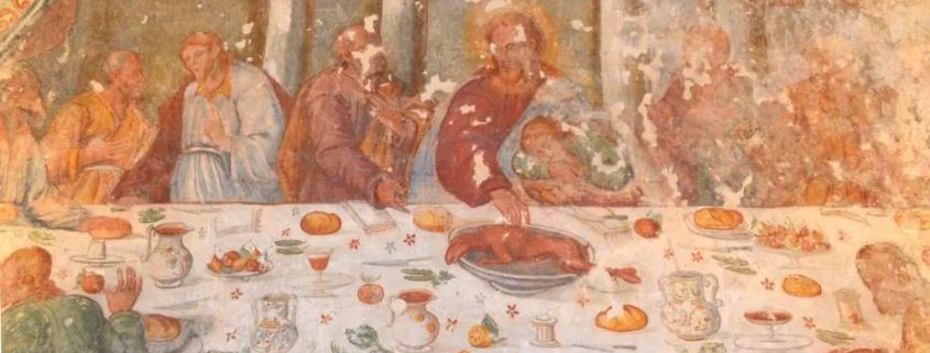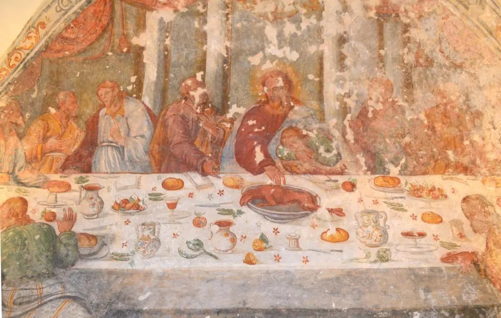 La tavola è imbandita con agnello, pane, frutta; vi sono tovaglioli con frange, bicchieri di vetro, brocche e anfore in ceramica con decori particolari. Recenti scavi archeologici svolti nel centro storico, datati al primo trentennio del ‘600, hanno restituito scarti di bottega sia in monocromia e policromia, del tutto simili agli esemplari riprodotti in questa opera pittorica, che così ha una più certa datazione.